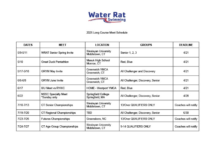 MOST IMPORTANTLY, the long course meet schedule is attached. As I mentioned in my last email, long course meets are quite competitive to get into. Please log-on ASAP to declare your intentions for the meets. We are still waiting on details for a few of the meets, and will get those posted as soon as possible. The deadline for most meets is listed as 4/21. We should hopefully have a little bit of leeway to make changes/updates further down the road, but please try your best to adhere to that deadline.